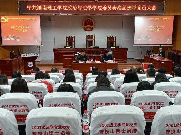 12月7日下午,中共湖南理工学院政治与法学学院委员会委员换届选举大会在八栋模拟法庭隆重举行。湖南理工学院党委委员、副校长刘亦工,全体党员师生党员出席本次会议,民主党派代表喻永红副教授、龙湘元博士应邀列席。会议由学院院长周四丁主持。