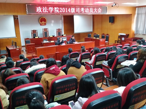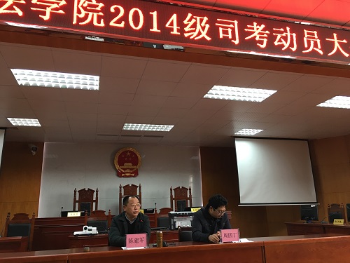 3月21日下午2时整,学院在模拟法庭召开2014级学生司法职业资格考试动员会。院长陈建军、党总支书记刘淳松、副院长周四丁、院长助理石蕙等学院领导出席会议,2014级法学专业全体同学参加会议。