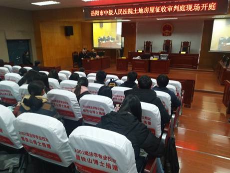 为了开阔学生的视野,扩充学生的专业知识,加大法学专业实训教学力度;同时,也为了进一步强化广大师生学习、生活和工作中的遵法、守法、懂法、用法意识,3月20日上午,岳阳市中级人民法院土地房屋征收审判庭首次将某房屋征折系列案件庭审搬至该院驻湖南理工学院“第六数字法庭”,即政ok138cn太阳集团模拟法庭现场开庭,15级法学专业学生以及部分专业老师参与了旁听。