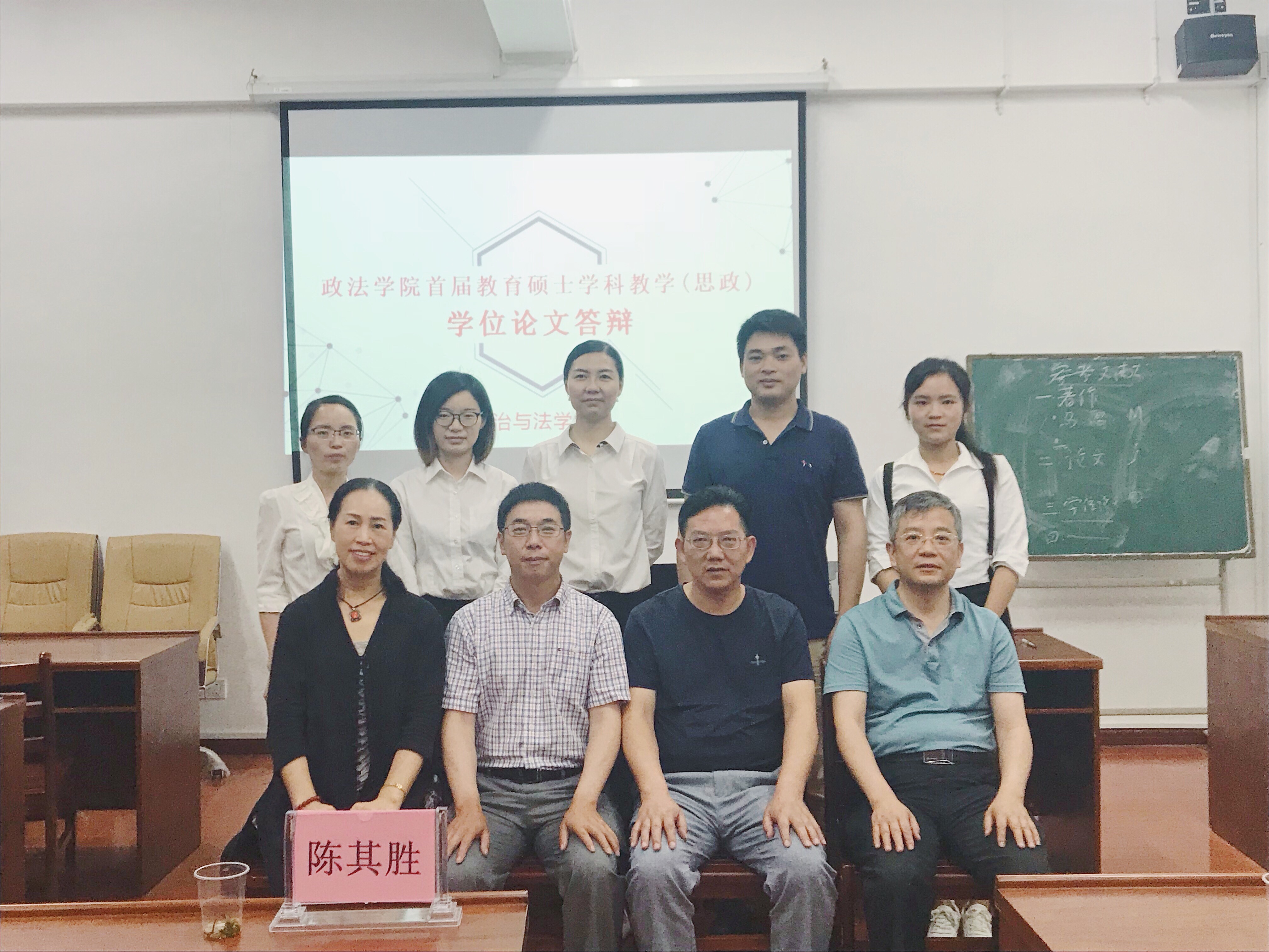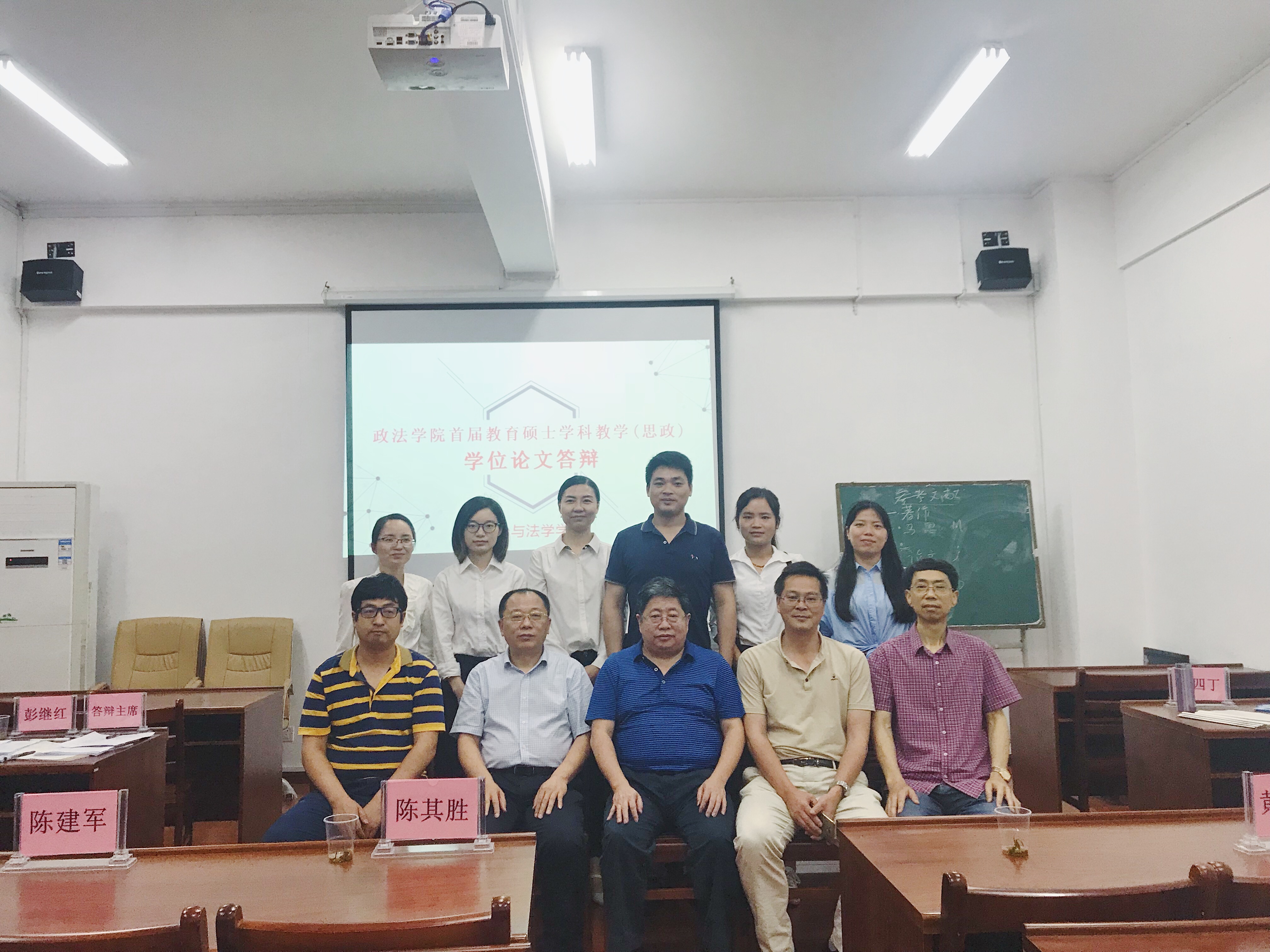 5月20日上午,我院2016级学科教学(思政)教育硕士学位论文答辩如期举行。答辩委员会由湖南师范大学公共管理学院副院长、博士生导师彭继红教授,岳阳市第十四中学高级教师黄正阳,湖南理工学院马克思主义学院陈其胜教授,政治与法学学院陈建军教授、周四丁副教授、2016级学科教学(思政)教育硕士研究生导师组成,2017级学科教学(思政)教育硕士研究生列席并旁听了答辩会。