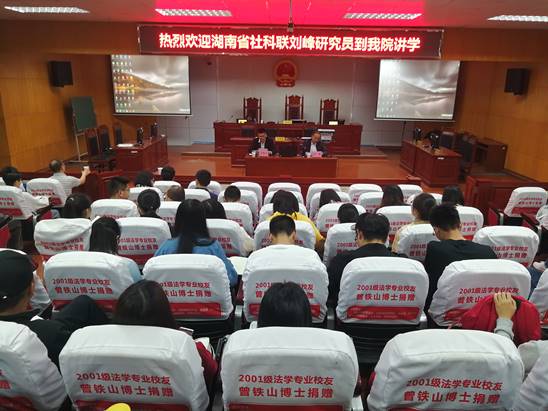 为进一步提升我院师生的学术水平,营造浓厚的学术研究氛围,我院于5月14日下午2时30分在8号教学楼模拟法庭举行了题为“社科学术论文撰写与投稿转载的若干问题”的学术报告。我院邀请《湖南社会科学》杂志社副社长、湖南省社科联研究员刘峰担任报告主讲嘉宾,报告由彭江辉副院长主持,学院全体教师及部分学生代表聆听了讲座。