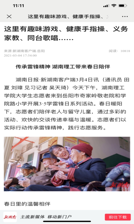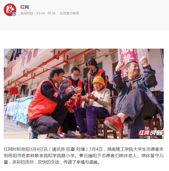 3月4日,我院“星火”为老志愿服务团队、“春行”关爱留守儿童志愿服务团队以实际行动践行雷锋精神的身影被人民日报人民号、新湖南、湖南红网等媒体相继报道。