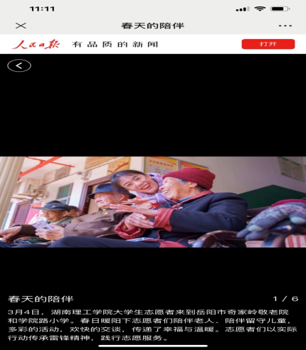 人民日报的人民号以“春天的陪伴”为题,报道了我院志愿服务团队志愿者们在岳阳市奇家岭敬老院、学院路小学开展陪伴服务的事迹。志愿者们现场指导老人做手指操、关节操、向老人传授健康保健知识、与老人同台歌唱新时代,为留守儿童或困难家庭子女提供义务家教、讲故事、做游戏、帮助儿童实现“微心愿”,以实际行动传承雷锋精神,践行志愿服务。