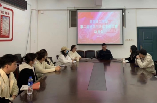 为认真学习贯彻落实习近平法治思想,加强研究生创新能力和实践能力培养,提升研究生运用法律思维和专业知识分析、解决实际问题的能力,提高研究生培养质量,学校特举办第二届研究生法律案例大赛。为了鼓励同学积极参与大赛,也为第七届湖南省研究生法律案例大赛做好准备,我院于2022年11月25日上午9:00在学院会议室召开湖南理工学院第二届研究生法律案例大赛动员会。本次动员大会由彭江辉副院长主讲,研究生辅导员周薇、研究生教学秘书余柳香以及全体研究生分会学生干部、法律硕士各班班长、学习委员参加本次动员会。