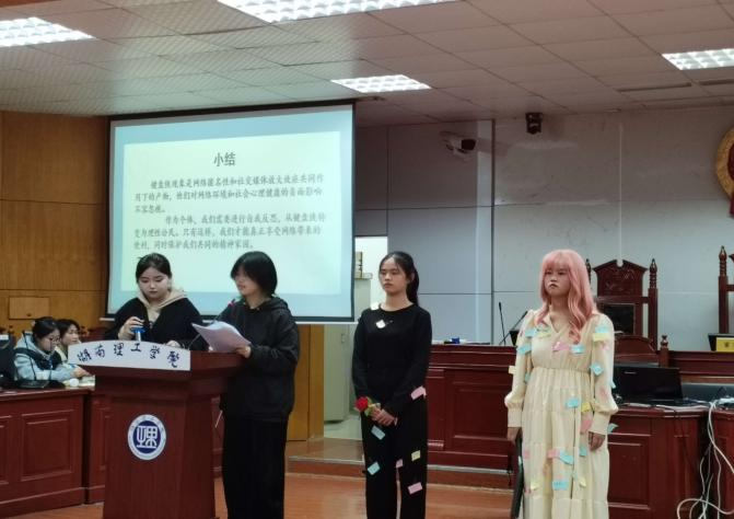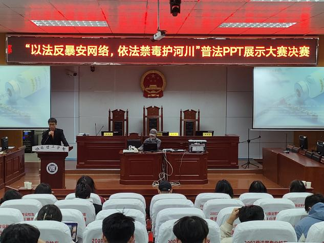 本次大赛旨在提高宣讲法律水平,巩固法律知识,以创新的PPT让法律更贴近学习和生活。来自不同班级,年级的选手们纷纷登台亮相,他们从禁毒普法、河流保护、网络暴力三个主题制作PPT,涵盖了诸多与日常生活息息相关的法律。选手们通过简洁的文字、生动的图片、有趣的表演将晦涩难懂的法律条文转化为通俗易懂的知识要点。宋佳颖团队以生动形象的现场演绎以及精美视频获得了评委一致认可,拿下了一等奖。
