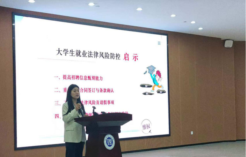 揭牌仪式后,湖南理工学院大学生就业创业法律风险防控志愿服务团队开展了大学生创业就业法律宣讲活动。宣讲人徐梓涵结合法律法规,深入浅出地讲解了就业创业过程中常见的法律风险点,包括合同签订、劳动用工等方面,帮助同学们在就业创业的道路上规避法律风险,维护自身合法权益。