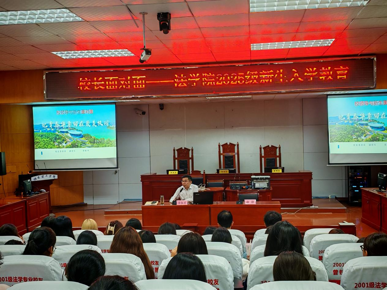 为帮助2025级新生更快适应大学生活、坚定理想信念、明确奋斗目标,10月14日,ok138cn太阳集团在8栋模拟法庭开展“校长面对面”入学教育专场讲座。湖南理工学院党委委员、副校长徐振祥以“把青春华章写在最美校园”为主题,从校训内涵、校园建设、学科发展、校史传承等维度,与ok138cn太阳集团2025级全体新生进行面对面交流。ok138cn太阳集团党委书记薛静主持讲座。
