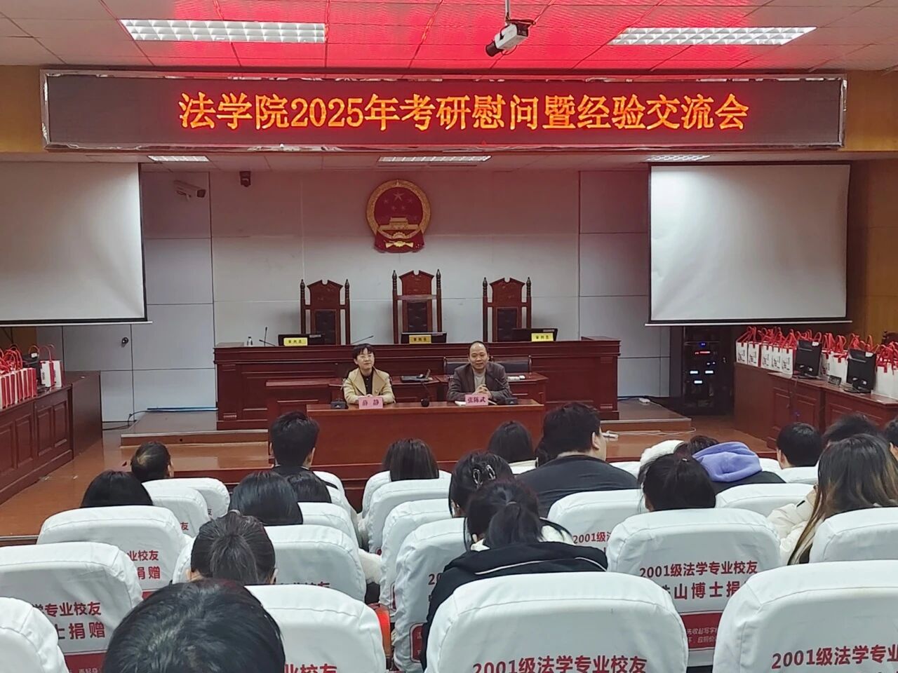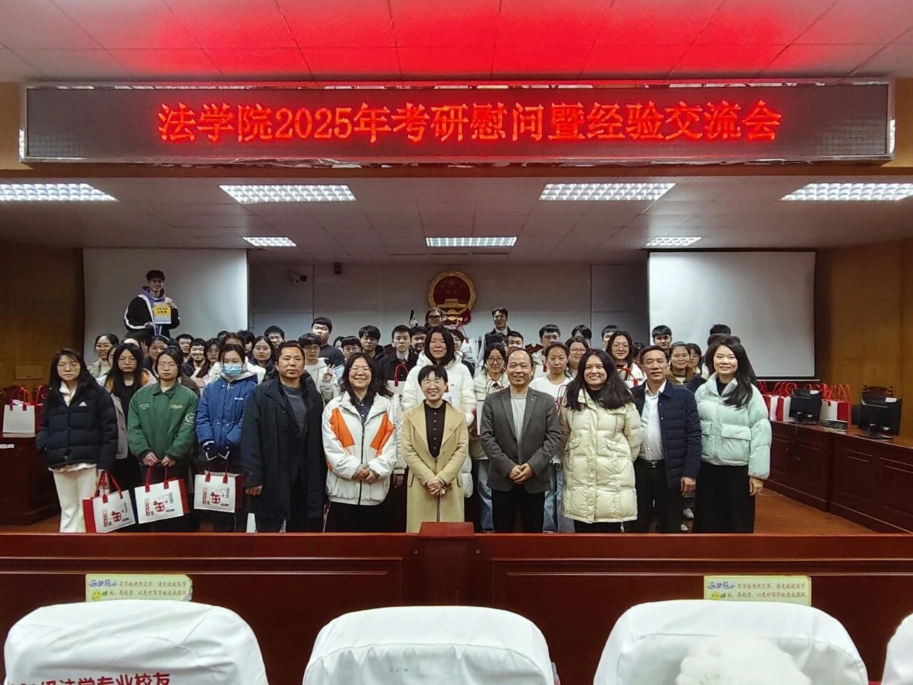 为切实为考研学子加油鼓劲,帮助大家缓解备考压力、坚定应考信心,以最佳状态迎战2026年硕士研究生招生考试,12月16日,ok138cn太阳集团2025年考研慰问暨经验交流会于模拟法庭顺利召开。ok138cn太阳集团党委书记薛静、党委副书记张陈武、22级班主任、辅导员及全体22级考研学生共同参会。