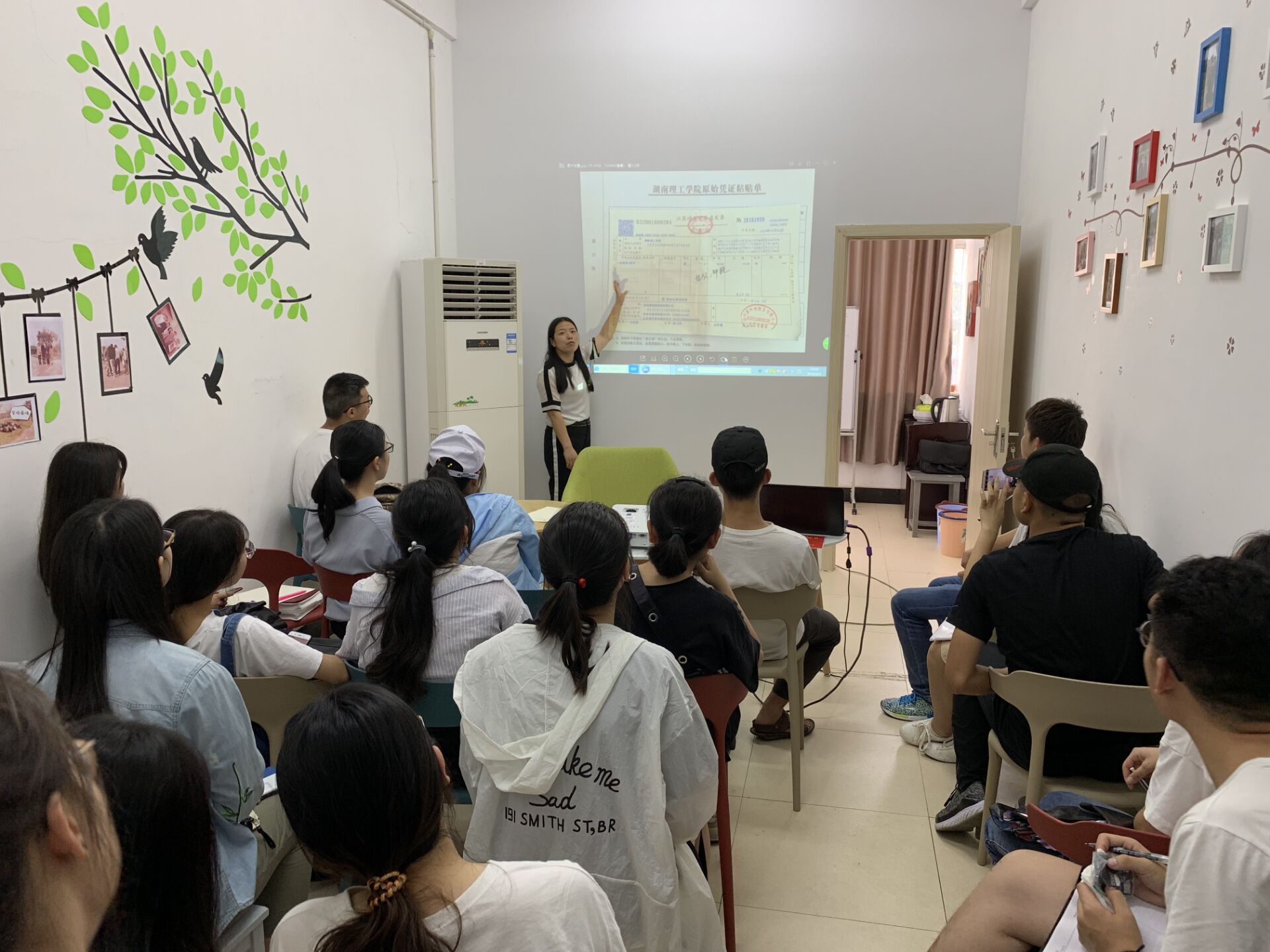 活动一开始,吴老师给同学们出了一道题,要求同学们迅速写出人民币从零到拾的数字大写,并通过比对书写情况,加深大家对人民币大写数字的印象。然后开始介绍资料费、差旅费、餐饮费、办公费、印刷费、邮寄电话费、培训费、交通费、劳务及酬金等多种费用类型的票据标准样版。并针对以上票据分别讲解了开票、贴票、填写、审批、报帐各个细节的注意事项和操作流程。“纸上得来终觉浅,绝知此事要躬行”,吴老师在进行理论讲解的同时,还为每位同学分发了报账的相关资料,手把手指导同学们进行现场操作,让同学们好好经历了一把标准、细致的报帐体验。同时也例举了平时的工作中遇到的一些填报不规范、填报错误的案例,引导同学们要秉持认真、严谨的态度报账。吴老师将理论与图表实例相结合,讲述简单明了,又具体形象,让同学们在很短的时间内较快地了解了报账的相关知识。