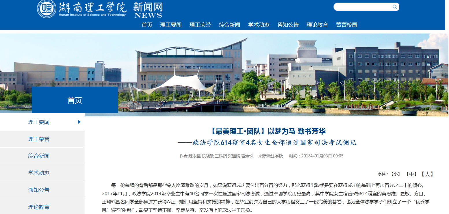 学校网站“理工要闻”栏目在“最美理工”专题版块中,以“以梦为马 勤书芳华——政ok138cn太阳集团614寝室4名女生全部通过国家司法考试侧记”为题,较长篇幅重点报道在国家司法考试中,政法学子潜心备考、学院领导认真帮扶的事迹。该报道为校网“最美理工”专题版块2018年度首秀。