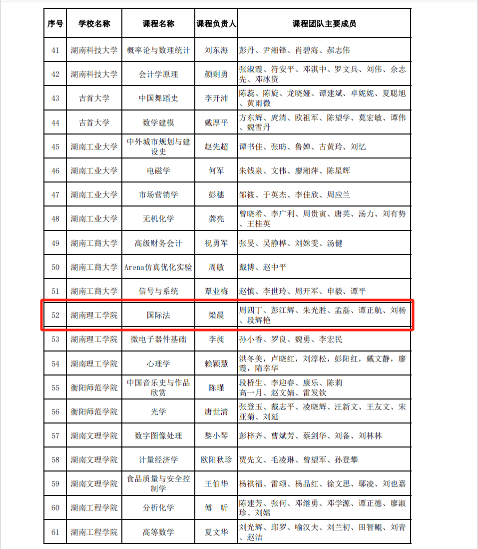 近日,湖南省教育厅印发了《关于公布2023年湖南省课程思政示范课程名单的通知》(湘教通〔2023〕351号)文件,公布了2023年湖南省课程思政示范课程的评审结果。我院教师梁晨副教授主持申报的《国际法》课程被认定为2023年湖南省课程思政示范课程,梁晨老师被认定为湖南省课程思政教学名师,《国际法》课程团队(梁晨、周四丁、彭江辉、朱光胜、孟磊、谭正航、刘杨、段辉艳)被认定为湖南省课程思政教学团队。这是我院深入贯彻落实立德树人根本任务、全面推进课程思政建设所取得的一项重要成果。