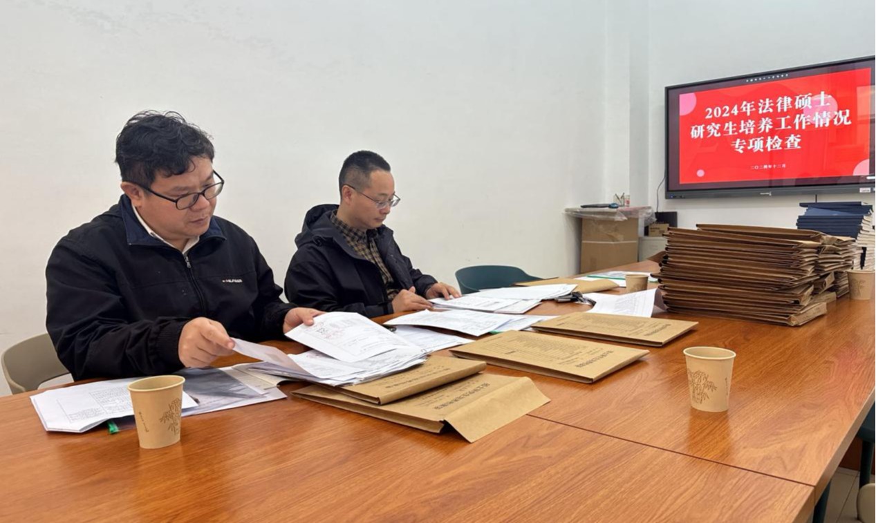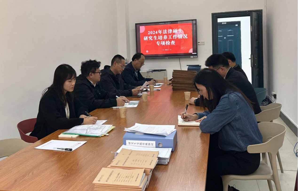 为进一步规范和加强研究生培养过程管理,提高研究生培养质量,2024年12月2日下午,研究生工作部对我院法律硕士学位点的研究生培养工作情况进行了专项检查。此次检查,由机械工程学院副院长谭晶莹、外国语言文学学院副院长赵中宝、物理与电子科学学院副院长邹志军和研究生工作部老师王雨婷联合组成的检查小组负责。我院彭江辉院长、副院长谭正航、研究生教学秘书余柳香分别就我院的法律硕士培养总体情况和分项工作进行了介绍。