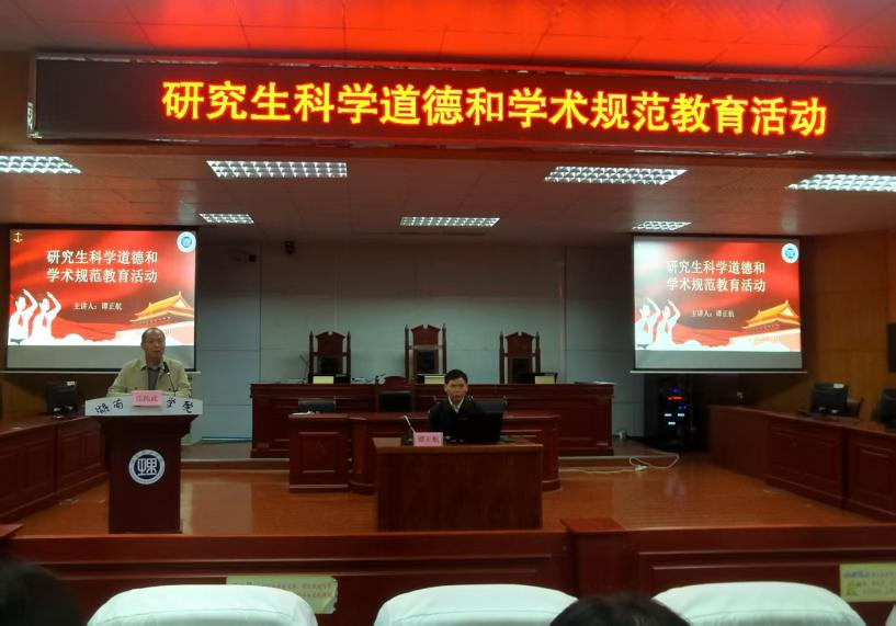 为强化法律硕士研究生的学术诚信意识,筑牢学术研究的道德根基,2025年11月9日,ok138cn太阳集团于模拟法庭举行研究生科学道德和学术规范教育活动。本次活动由ok138cn太阳集团党委副书记张陈武主持,ok138cn太阳集团副院长谭正航教授主讲,2024级、2025级法律硕士研究生共同参与。