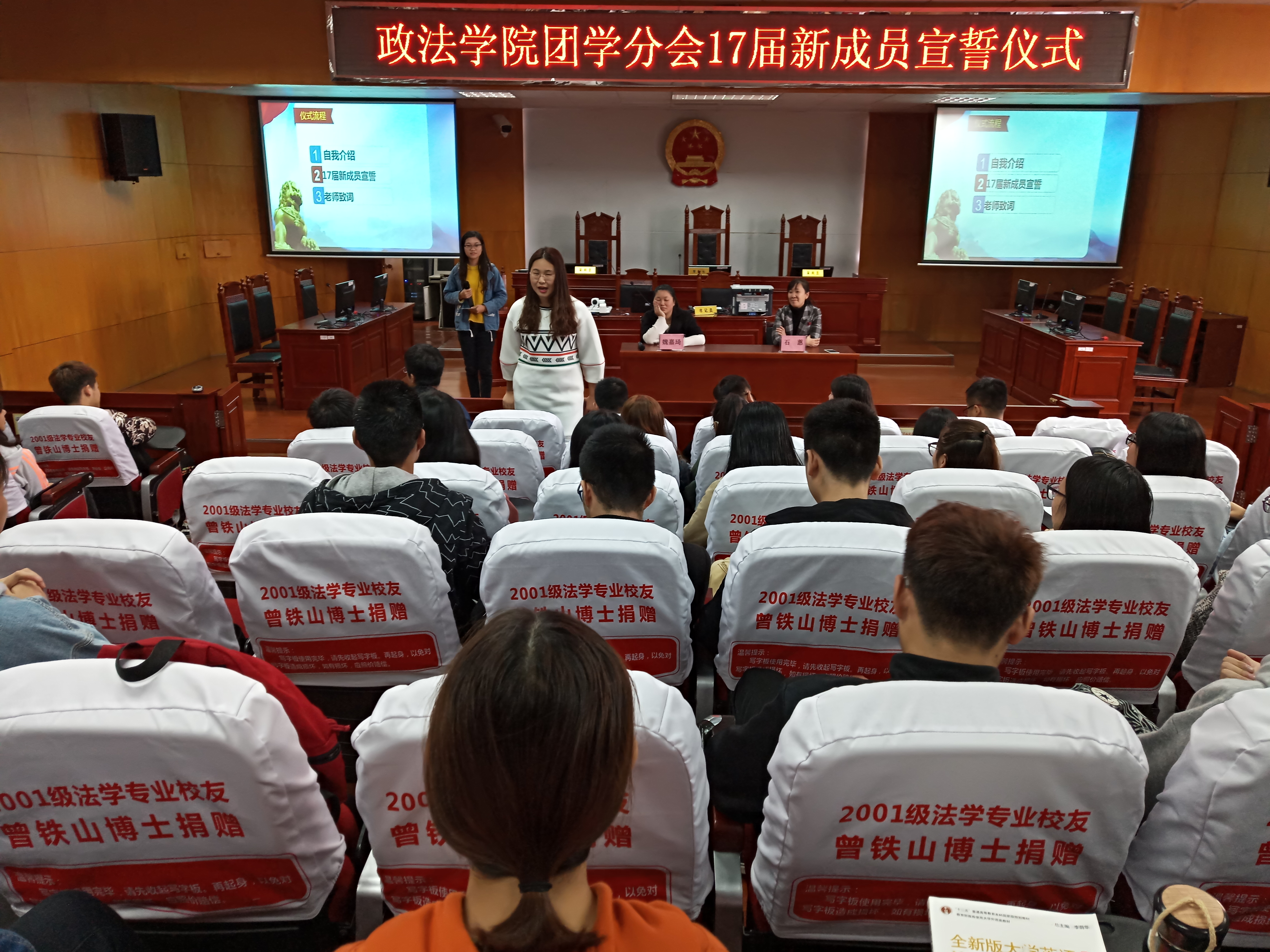 10月19日中午12时,政ok138cn太阳集团团总支学生分会2017级新干事入职宣誓仪式在8号教学楼模拟法庭举行。学院党总支副书记石蕙、团总支书记魏嘉琦、学院团学分会主席团成员、各部门学生干部干事参加此次会议。