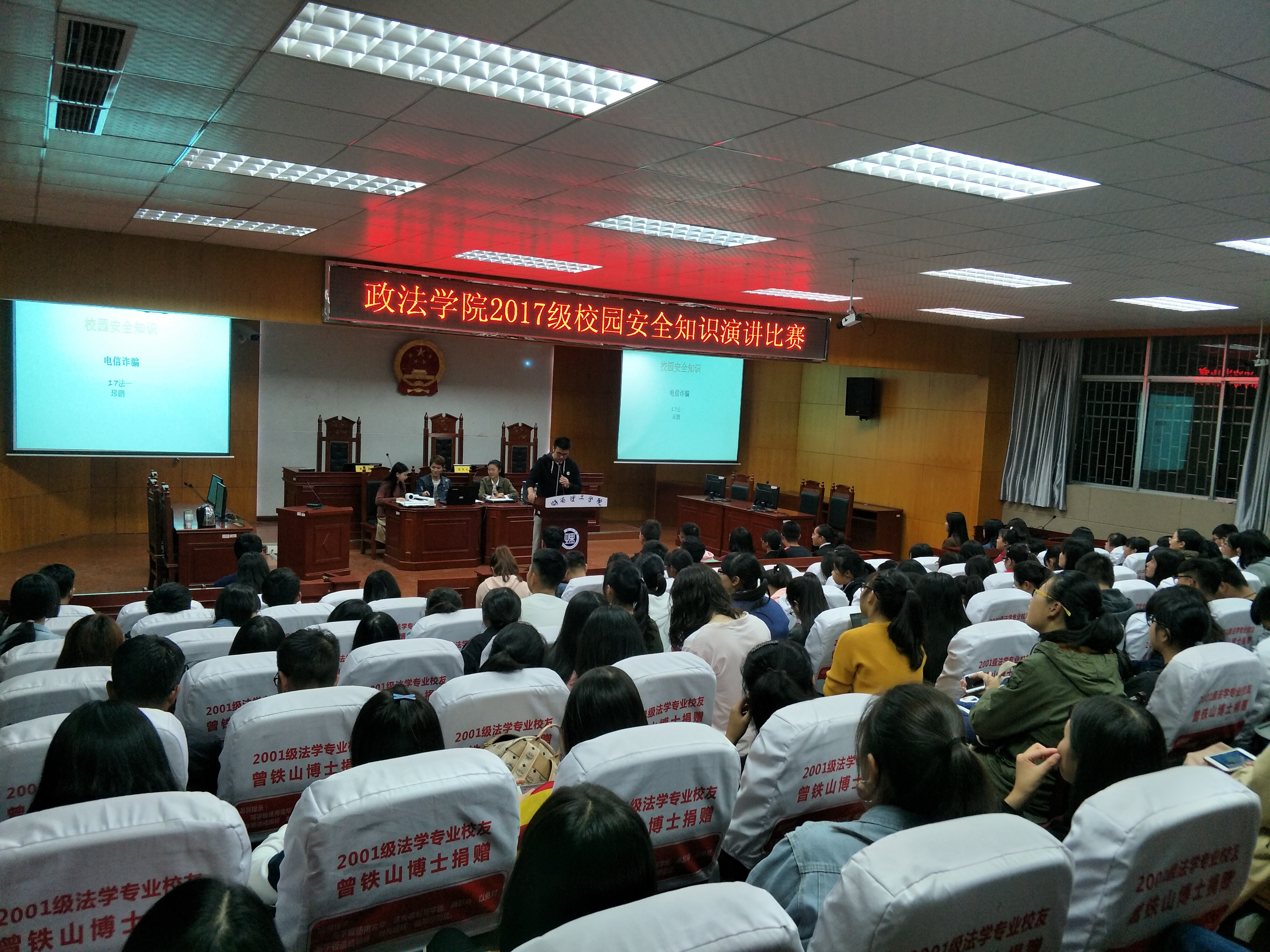 为提高学生的安全防范意识,营造平安和谐的校园环境,10月31日晚7时,政ok138cn太阳集团在8号教学楼模拟法庭开展校园安全知识演讲比赛,学院团学分会学生干部、2017级学生参加了此次演讲比赛。