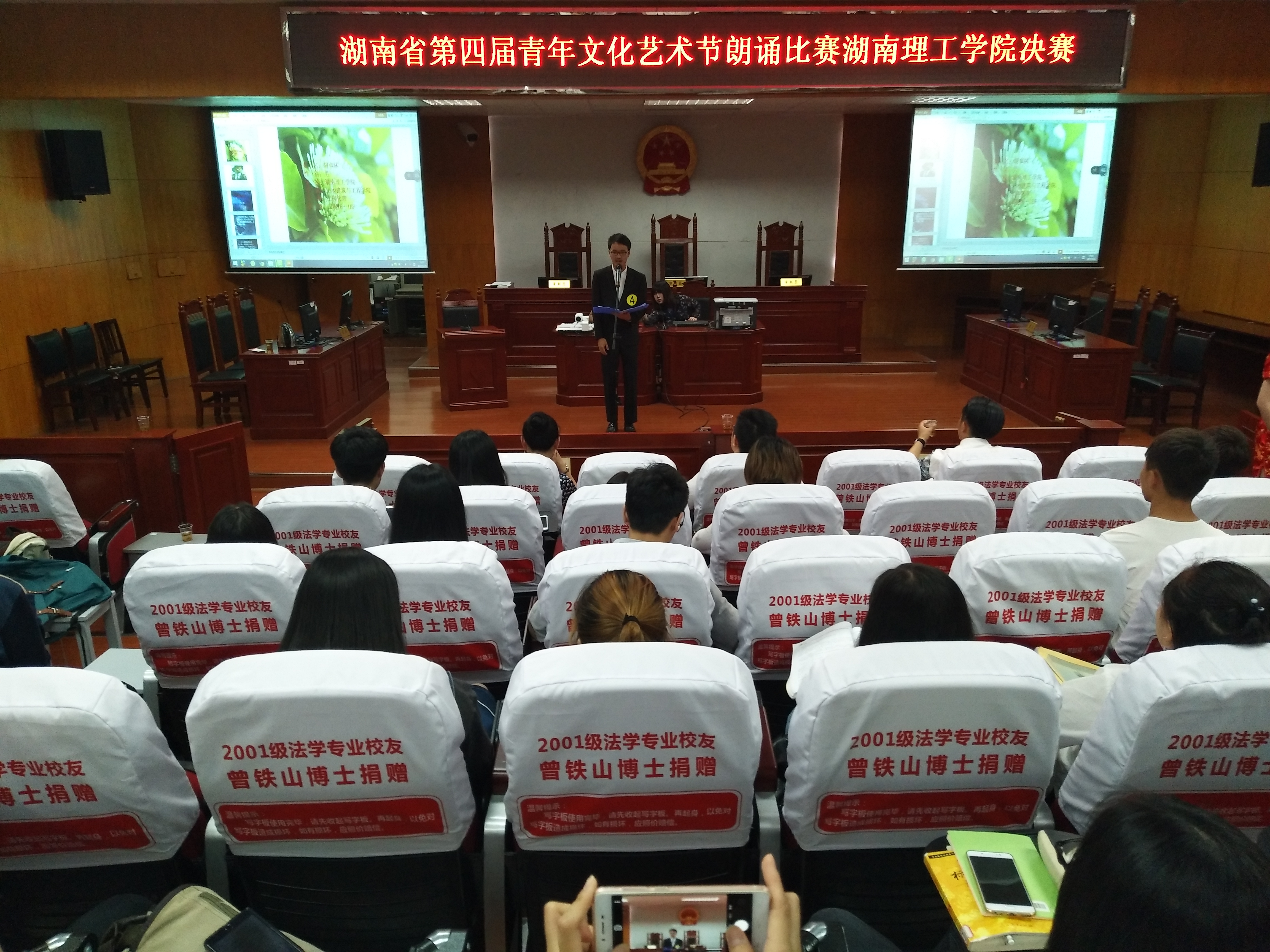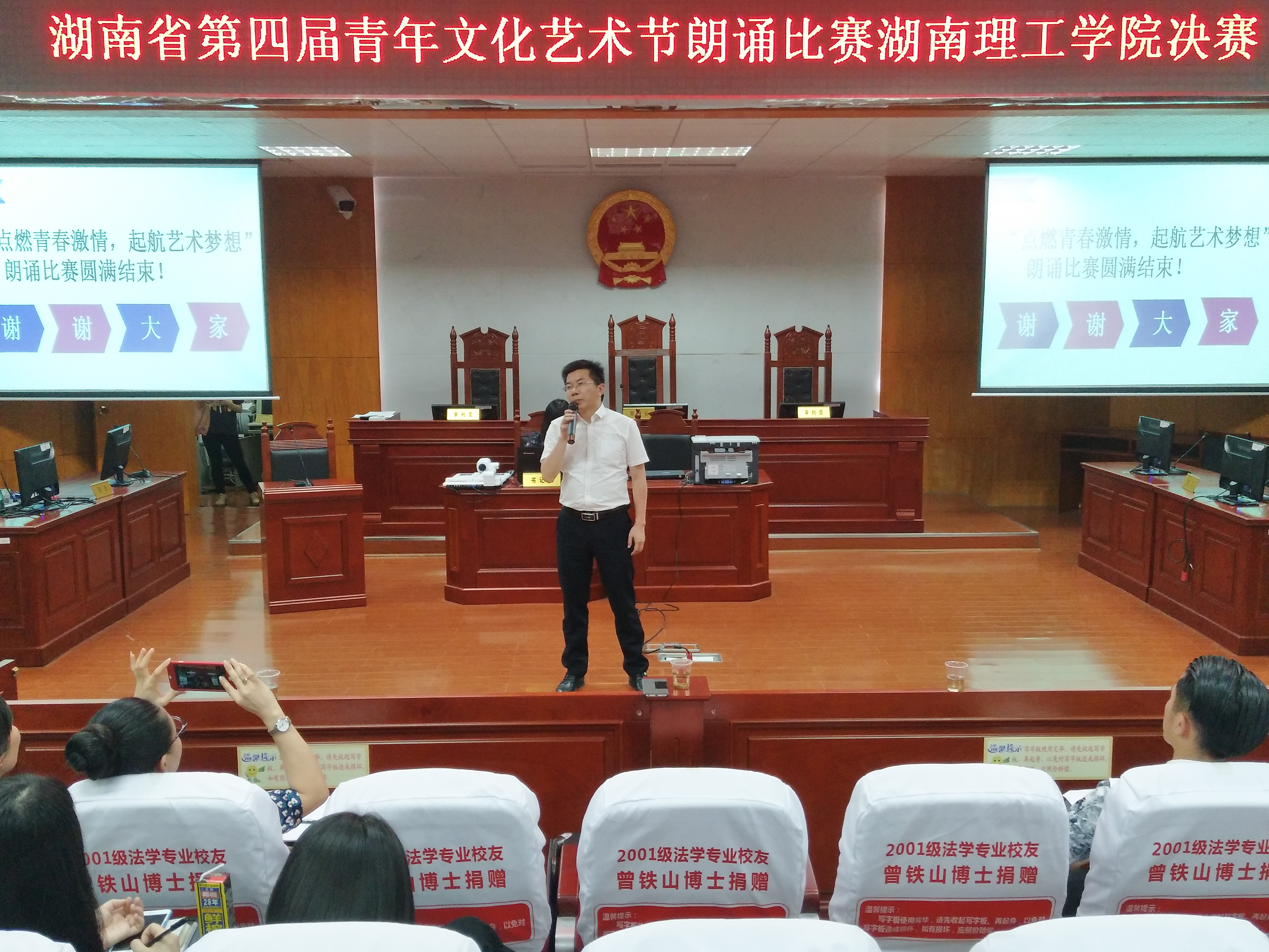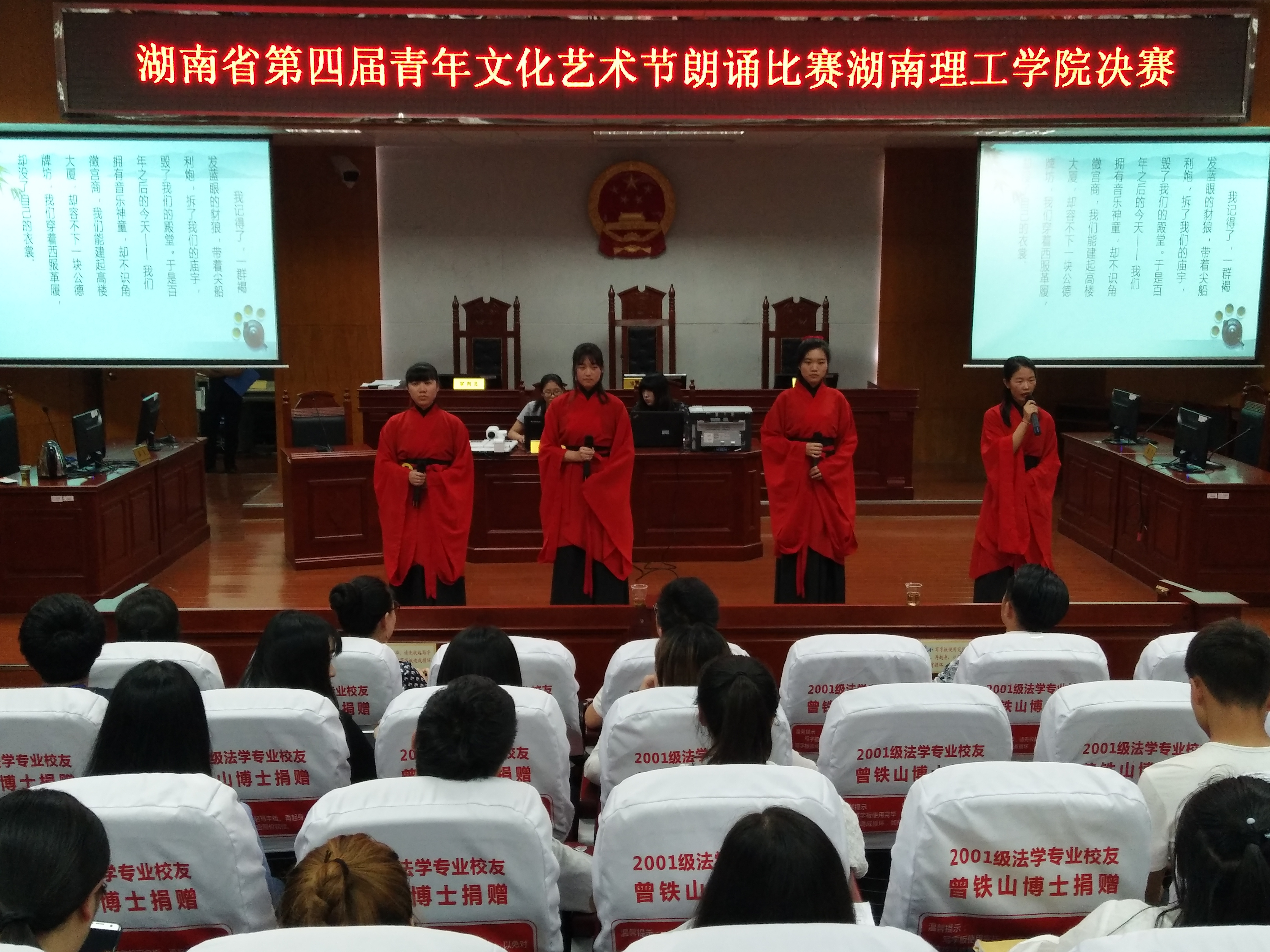 由我校主办,政ok138cn太阳集团承办的湖南省第四届青年文化艺术节朗诵比赛“点燃青春激情起航艺术梦想”湖南理工学院赛区决赛于5月26日晚在政ok138cn太阳集团模拟法庭举行。我校党委学工部、党委武装部部长徐振祥,学校新闻中心主任潘昕,南湖学院学生评委代表田志诚同学莅临本次大赛并担任评委。政ok138cn太阳集团党总支副书记石蕙、辅导员杨宗圆和王旭智出席了此次比赛。政ok138cn太阳集团团学分会主席团及学校各个学院团总支、学生分会团总支副书记、文娱部部长、共青团湖南理工学院委员会大学生艺术团数名成员聆听了此次比赛。本次比赛由政ok138cn太阳集团2016级思政班的彭依依担任主持人。