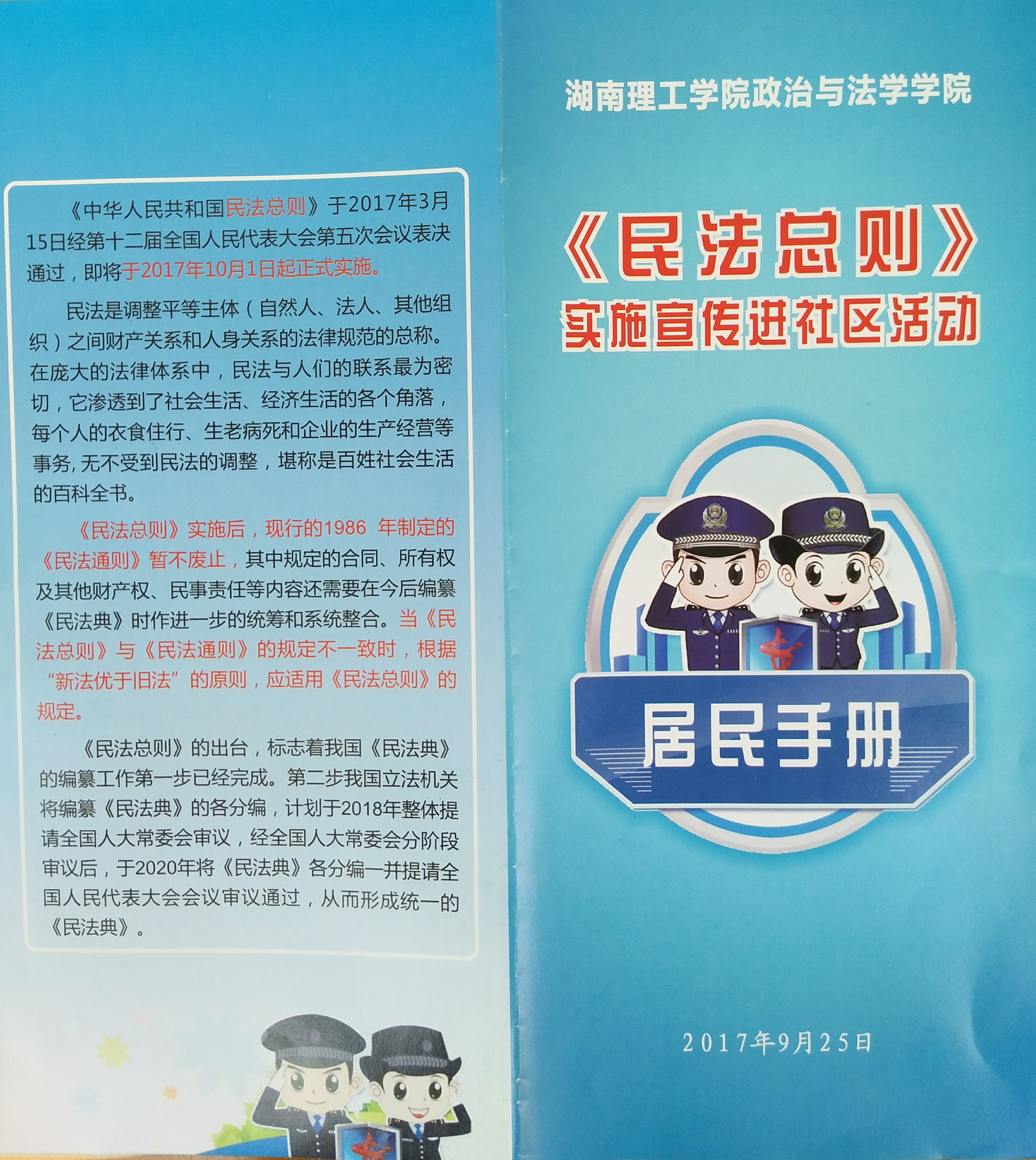 关系人民群众切身利益的《民法总则》即将于2017年10月1日起施行。为了让广大市民学好、用好这部法律,9月25日上午,政ok138cn太阳集团在岳阳市岳阳楼区学院路社区开展了《民法总则》实施宣传进社区活动。政ok138cn太阳集团副院长周四丁、党总支副书记石蕙、法学教师喻永红、徐祖林、曹乔华以及学院法学专业部分学生参加了此次活动。