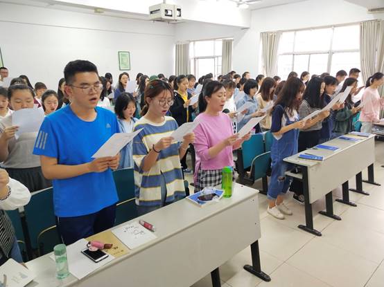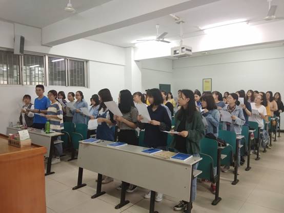 为响应学校学工部关于开展“献礼祖国华诞,放飞青春梦想——大学生课前三分钟爱国朗诵”主题活动的号召,进一步增强学生的家国情怀,5月5日,爱国朗读活动开始的第一天清晨,学院2018级思想政治教育一班、思想政治教育二班全体同学早早就来到教室,开始进行课前三分钟爱国朗读活动的准备,学院党总支副书记石蕙老师陪同同学们一起高声朗读。