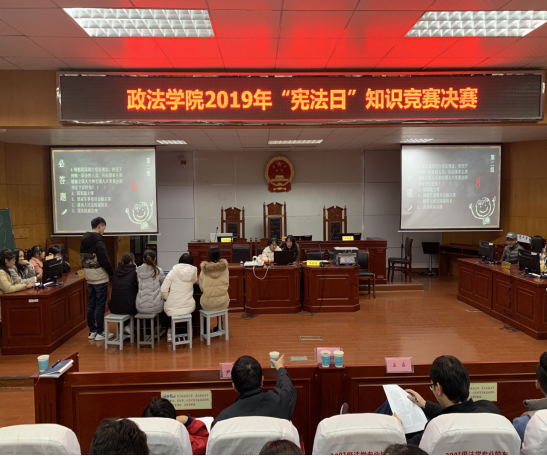 “宪法日知识竞赛”是政治与法学学院每年“宪法宣传周”的固定活动。活动得到了同学们的积极响应,除大四毕业年级外,大一、大二、大三等各年级各专业共派出11支代表队参赛,在必答题、抢答题及论述题三种题型的轮番比拼之下,同学们对宪法知识的掌握得到了进一步巩固,取得了良好的教育效果。