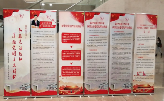 12月1日,由学校党委宣传部、政治与法学学院联合推出2019年湖南理工学院“宪法宣传周”系列展板,通过“习近平总书记关于宪法的重要论述”、“新中国宪法的发展历程”、“新中国成立七十年来我国法治建设的辉煌成就”、“十九届四中全会关于国家根本制度、基本制度、重要制度的论述”四个方面的内容全面完整地宣传了宪法知识,以期达到弘扬宪法精神、树立宪法权威的目的。展板分别在学校新图书馆、综合楼、政治与法学学院所在八号教学楼三个地点推出后,受到了来往学生们的关注,陆续有学生驻足在展板前学习和了解宪法知识。政治与法学学院辅导员老师们还专程组织学院学生们一起重温和学习宪法知识。