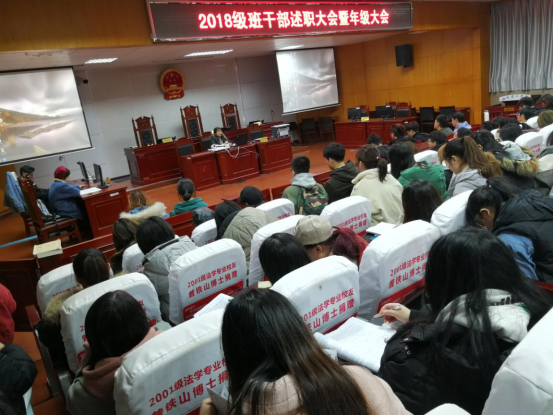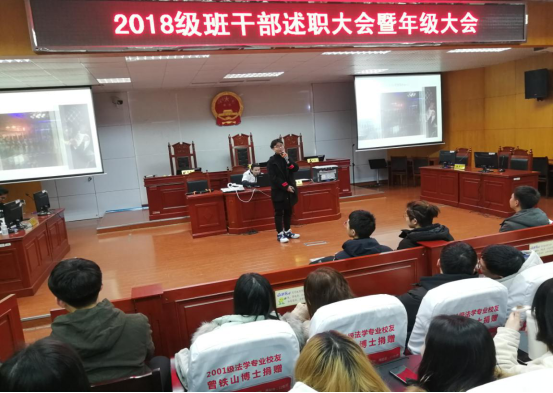 为总结班级工作成效,提升班级管理的争先创优意识,并安排好学期末相关工作,12月24日晚,政ok138cn太阳集团在八栋教学楼模拟法庭举行了2018级班干部述职暨期末年级大会。会议由2018级辅导员魏嘉琦主持,2018级全体学生参加会议。