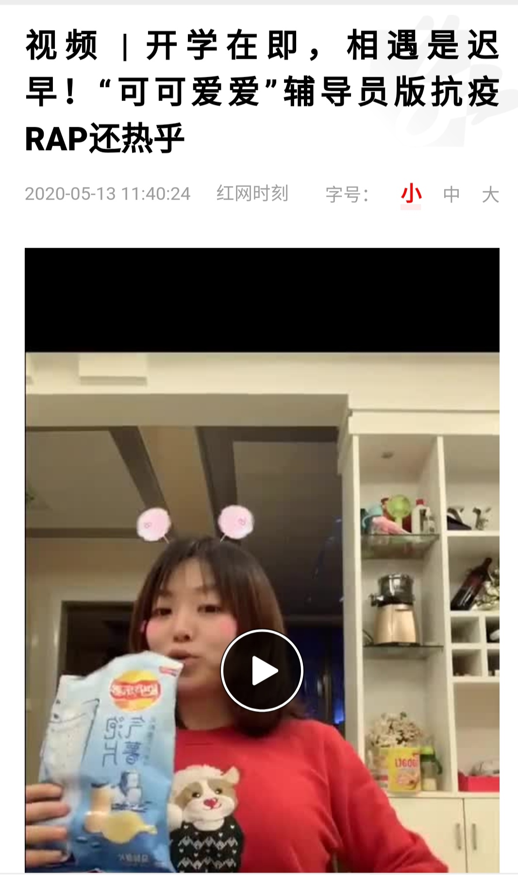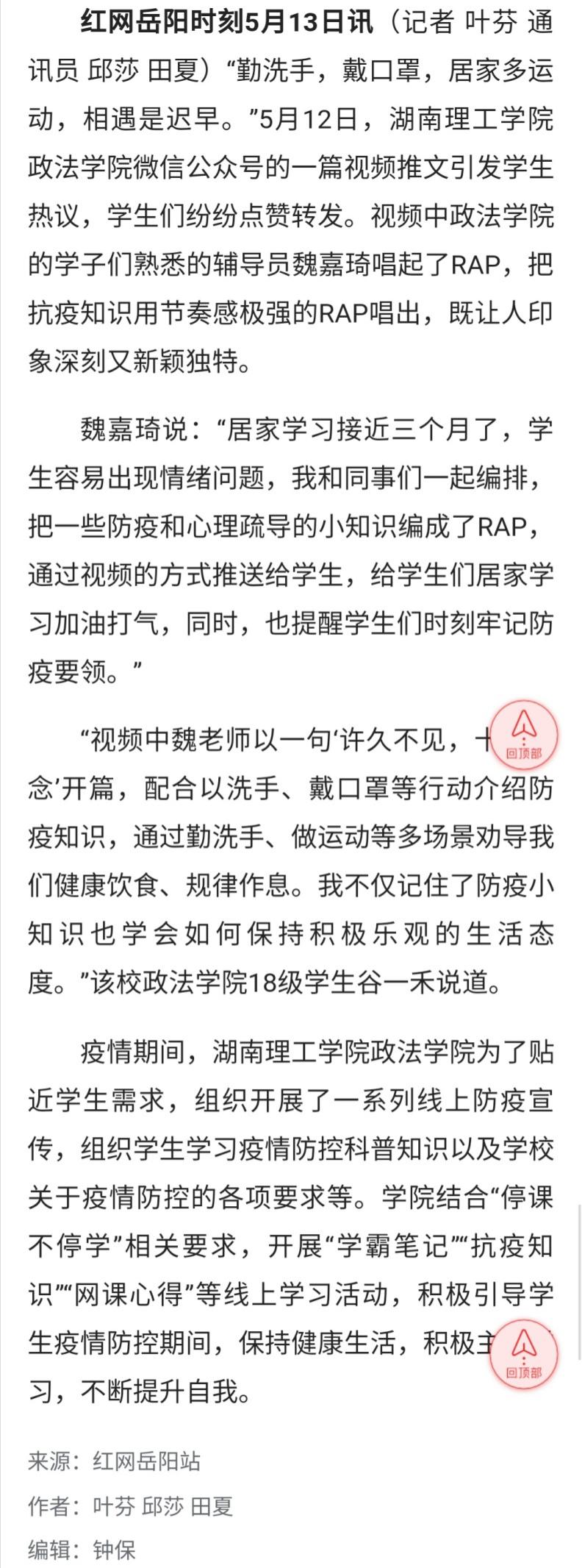 5月13日,湖南红网在首页资讯的“岳阳站”的栏目中,以“视频|开学在即,相遇是迟早!‘可可爱爱’辅导员版抗疫RAP还热乎”为题,报道了我院2018级辅导员魏嘉琦在学院线上防疫一系列活动中为贴近学生生活,及时疏导学生隔离在家而产生的不良情绪采用的年轻人喜闻乐见的rap小视频方式来进行抗疫知识科普的事迹,以实际行动践行抗疫主题教育。