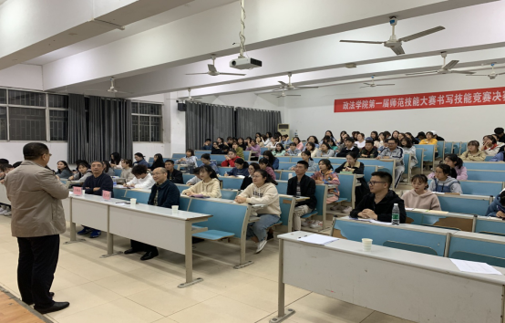 陈建军书记首先上台致词,他谈到此次第一届师范技能大赛设计了片段教学、多媒体课件、书写技能、班级管理等多个竞赛项目,这些项目都是师范生的基本功,希望学院全体师范生及未来有从教意愿的法学生都能抓住机会,在竞赛中提升能力,增长本领,争当一名优秀的人民教师,站稳讲台。