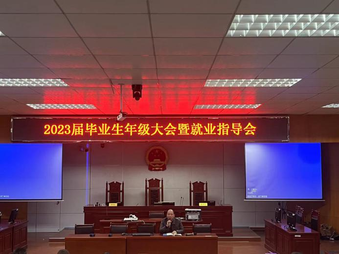 【本站讯】为帮助毕业生明确未来就业方向,顺利完成毕业,我院于3月30日在模拟法庭召开2023届毕业生年级大会暨就业指导会。党委书记喻义东、党委副书记张陈武、就业专干王旭智、教学秘书任蓉以及全体毕业生参加此次会议。