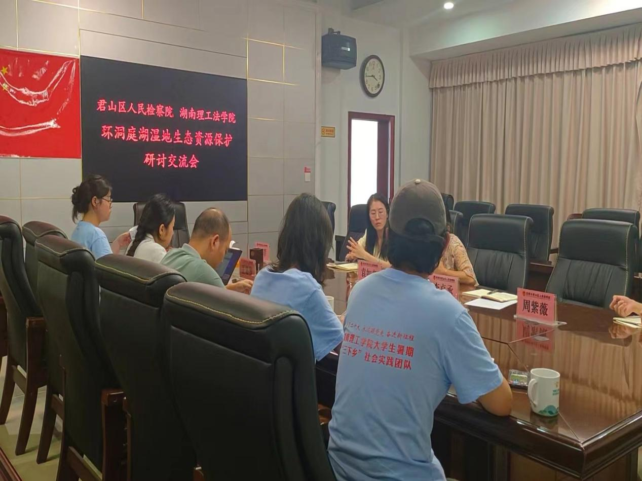 如何守护好一江碧水,贯彻实行习总书记的重要指示精神,将生态资源保护与推动绿色发展相结合,在这场“碧水保卫战”中探索的经验道路值得不断研究和讨论。2023年7月13日,环洞庭湖湿地生态资源保护研讨交流会在岳阳市君山区人民检察院举行,湖南理工ok138cn太阳集团党委副书记张陈武、ok138cn太阳集团河小青普法志愿服务团队、岳阳市君山区人民检察院副检察长袁如意、岳阳市君山区人民检察院政治部主任李卓承以及相关工作人员参加了此次会议。