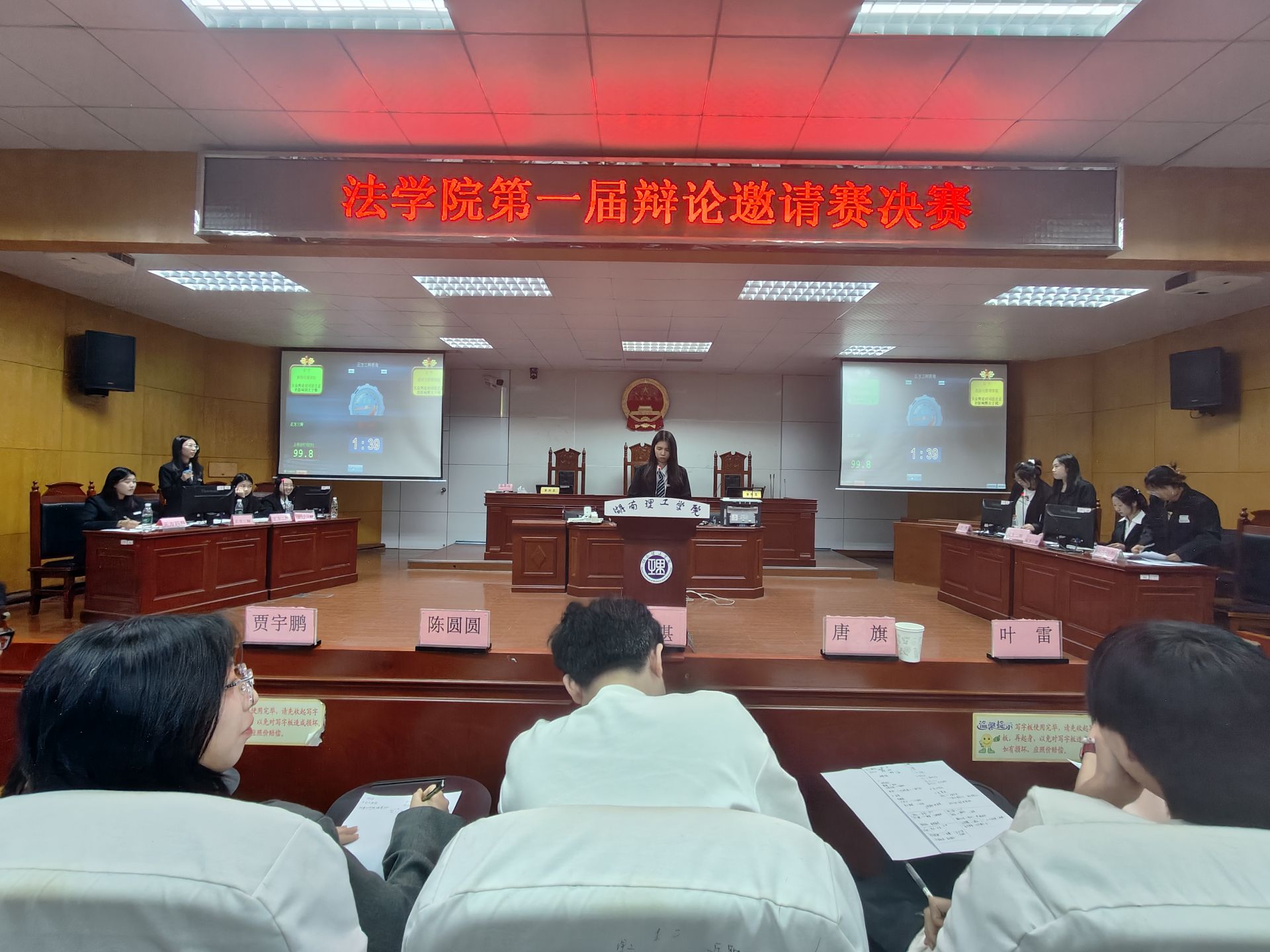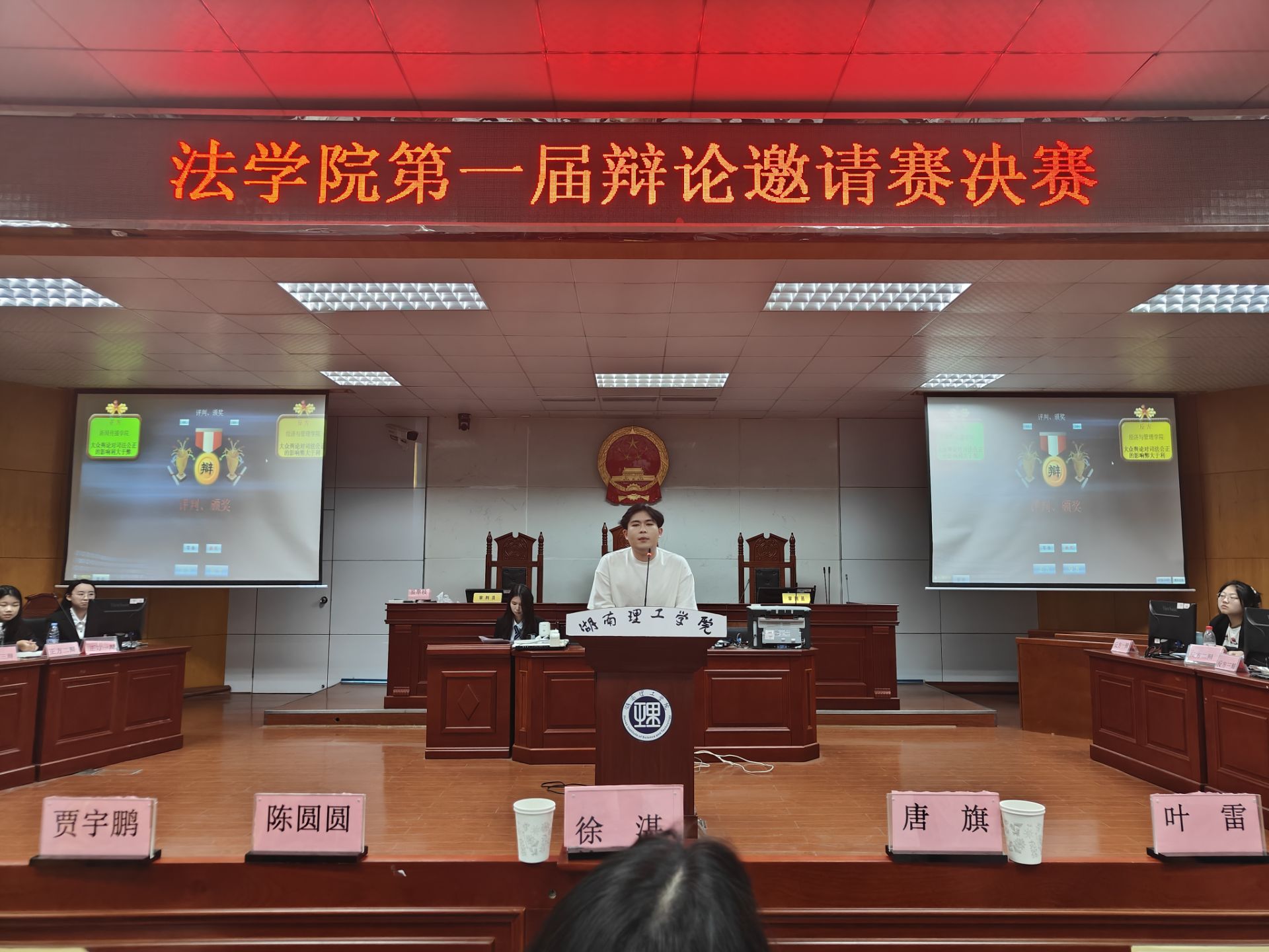 决赛于模拟法庭进行,辩题为:“大众舆论对司法公正是利大于弊还是弊大于利”,新闻学院辩论队为正方,经济与管理学院辩论队为反方,ok138cn太阳集团辩论队成员贺佳欣担任主席。比赛邀请到了ok138cn太阳集团研究生辩论队成员徐湛、21级校辩论队成员唐旗、陈圆圆、贾宇鹏以及ok138cn太阳集团团总支学生分会副主席叶雷担任评委。