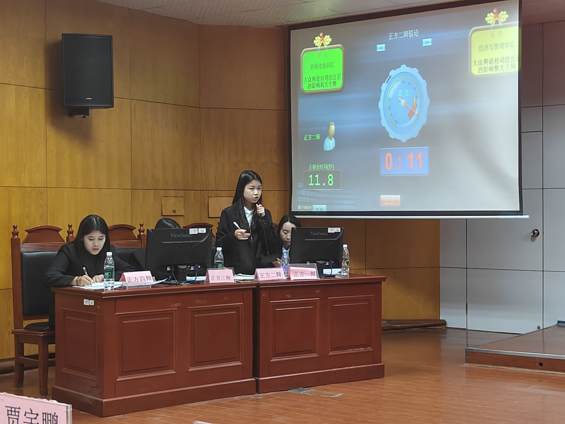 比赛过程十分激烈,双方各自围绕论点进行攻防,正方认为大众舆论是对司法公正的补充,是对司法公正的监督,而反方在质疑大众舆论监督效力的同时围绕舆论本身的可操作性与进行司法监督的门槛两点进行攻防,论证大众舆论影响司法对司法公正的弊端,战场气氛逐渐升温。