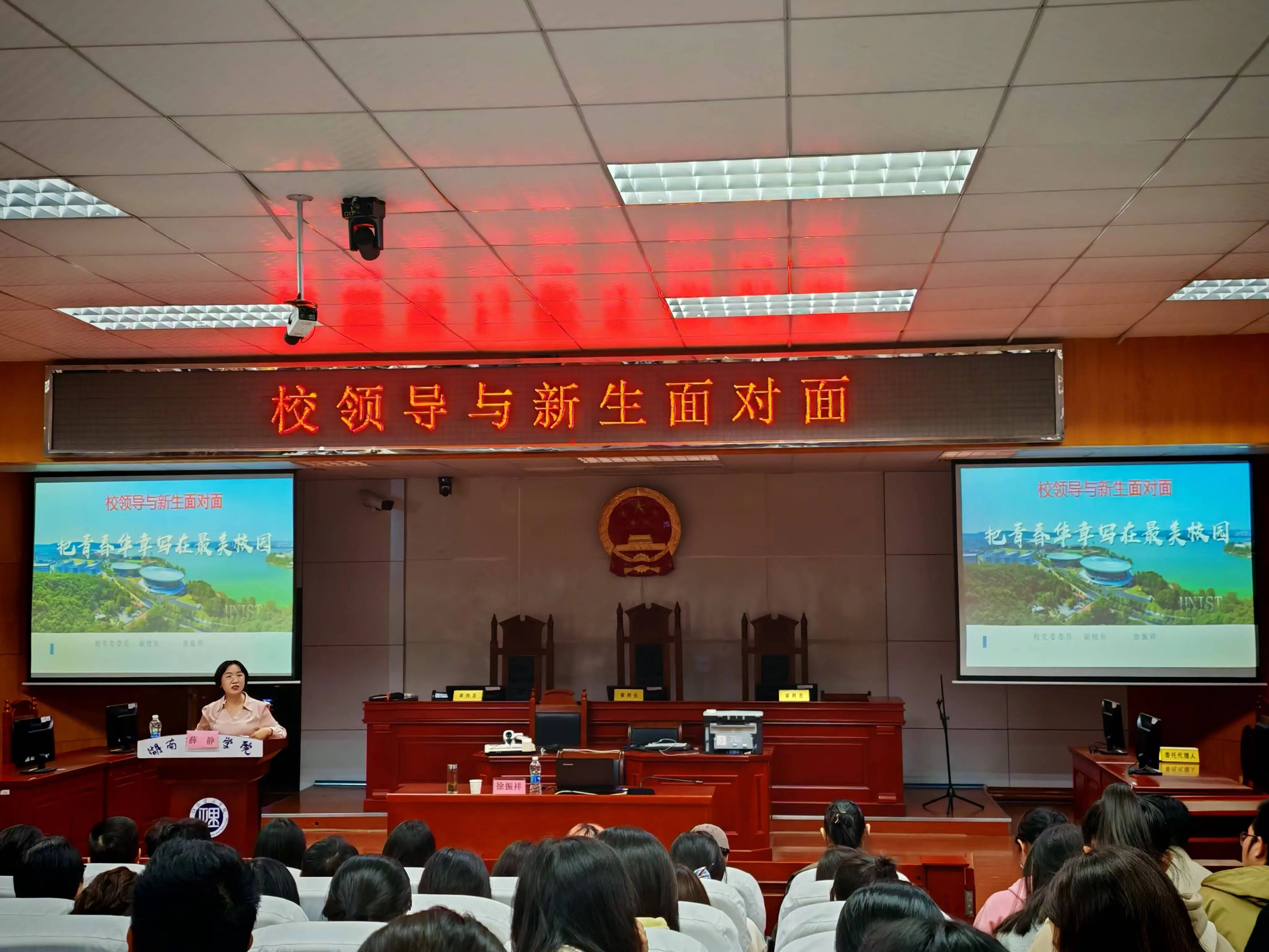 【本站讯】为提高2024级ok138cn太阳集团新生对大学的归属感和参与感,帮助新生尽快适应大学的学习生活,2024年10月30日晚,ok138cn太阳集团于模拟法庭举行校领导与2024级全体新生面对面交流讲座,本次活动邀请了徐振祥副校长主讲,党委书记薛静主持。
