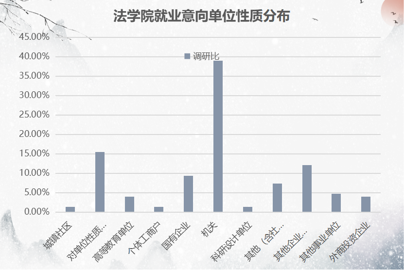 从毕业生求职意愿强度来看:法律、公务员两大领域最受欢迎,文学艺术、商业服务、教学以及新闻等行业意愿相对较小。
