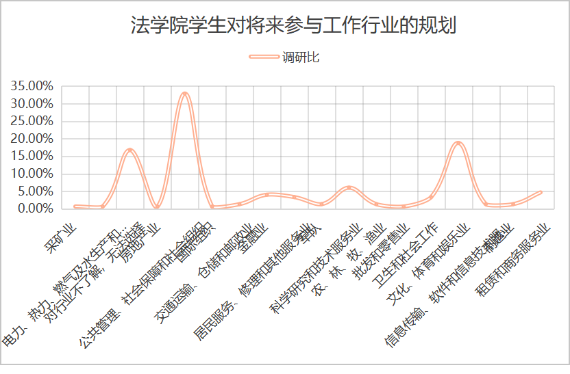 从图中可以看出来,大多数毕业生对于未来工作的规划都是公共管理、社会保障、社会组织这种跟专业适配度高的行业,亦或是文化、体育和娱乐业等感兴趣的行业。