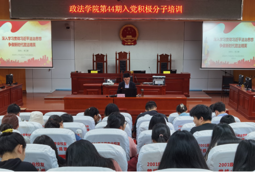 为深入学习贯彻习近平法治思想,4月20日下午14时,政ok138cn太阳集团党委委员、副院长彭江辉在八栋教学楼模拟法庭主讲“深入学习贯彻习近平法治思想,争做新时代政法精英”专题党课,第44期入党积极分子聆听专题党课。