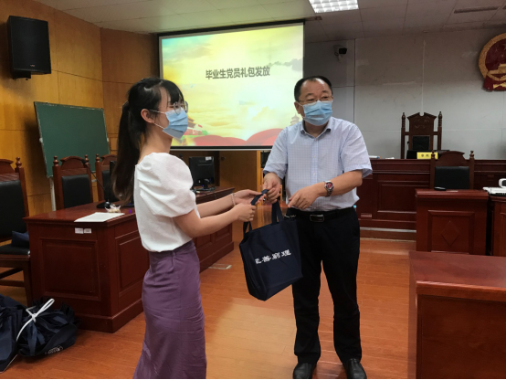 最后,陈建军书记向全体毕业生党员赠送了毕业礼包,沉甸甸的礼包承载着学校和学院对政法学子的期望和祝福。
