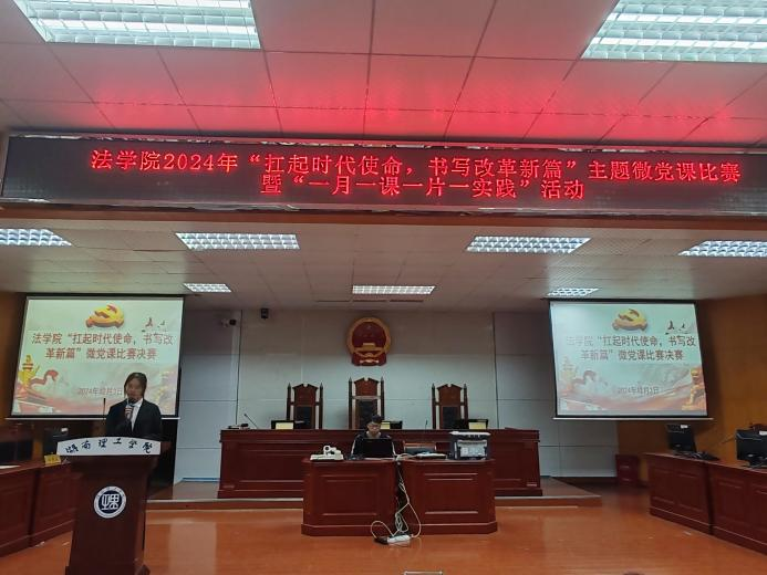 【本站讯】为锤炼党员党性修养,推动“以课带学,以赛促学”,12月3日19:00于8T2模拟法庭,ok138cn太阳集团党委开展“扛起时代使命,书写改革新篇”微党课比赛暨“一月一课一片一实践”活动。ok138cn太阳集团组织员出席,全体学生党员及第50、51期入党积极分子参加。